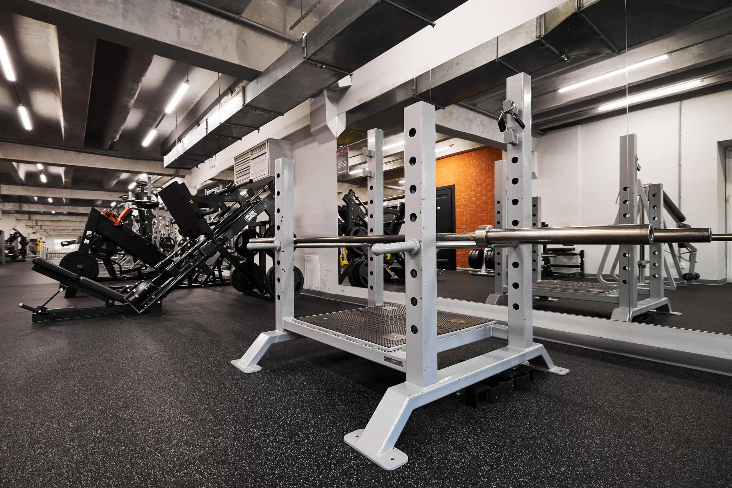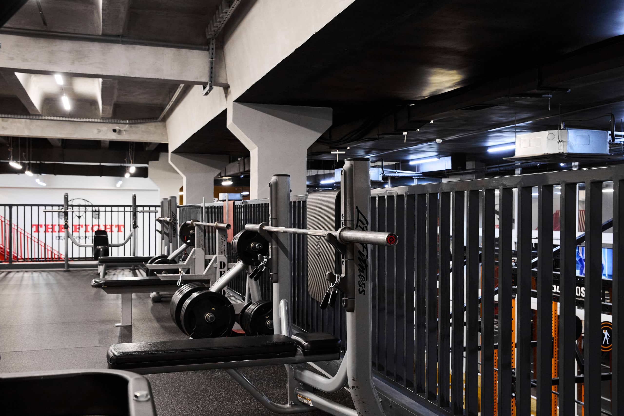 7 скамеек для жима лежа. 7 отдельных стоек для приседаний и 4 в зоне кроссфита