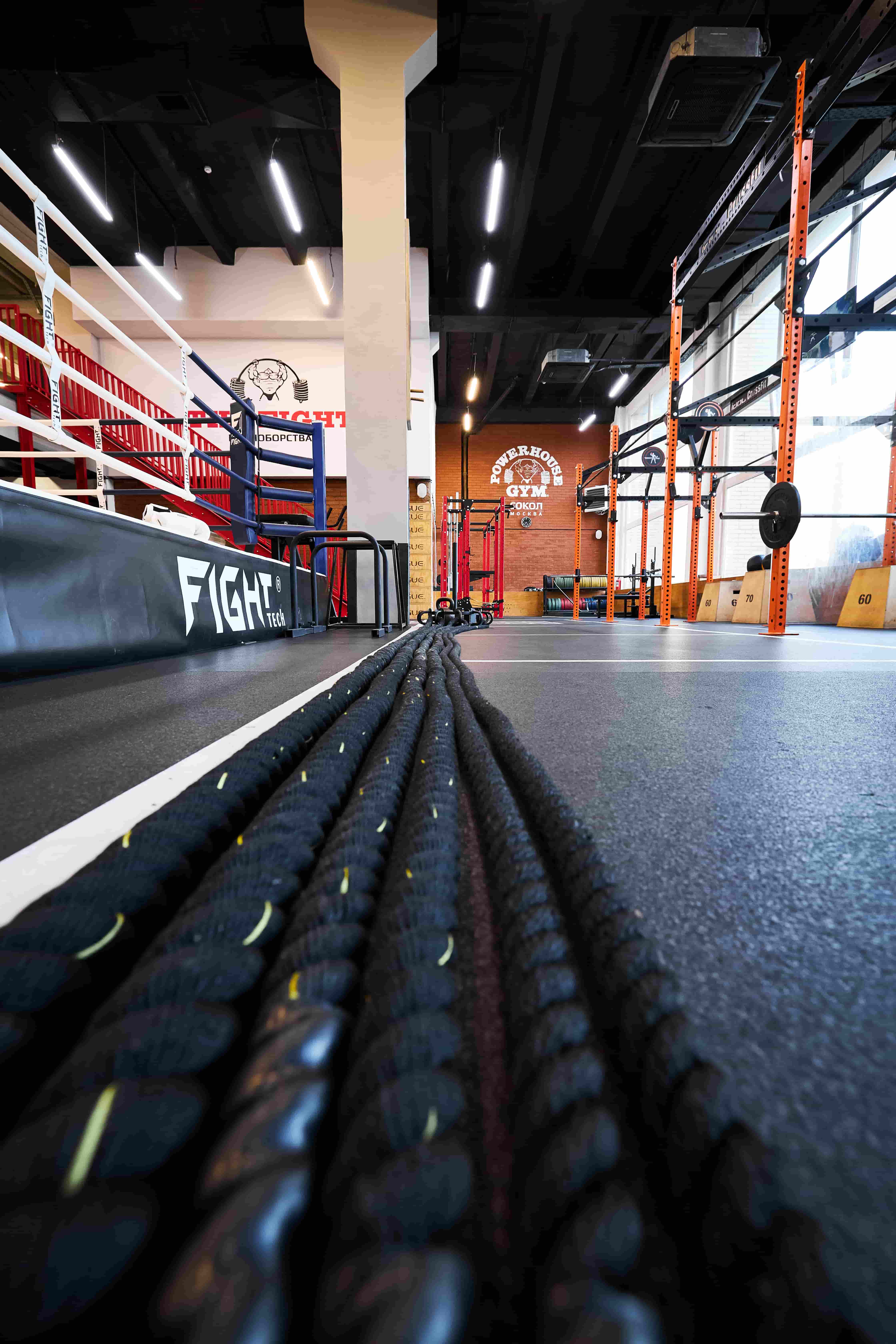 - Штанги с разными грифами, плиобоксы, мячи, мешки, канаты, петли TRX, гири, кувалда, большой ряд гантелей